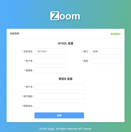 Start Running...2、打开浏览器,访问 http://localhost:7002 (出现下图界面),配置数据库及管理员信息,安装完成。
