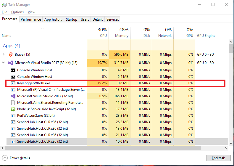 - After a while turn off KeyLoggerWIN10.exe in Task Manager->Processes->KeyLoggerWIN10.exe->End task.