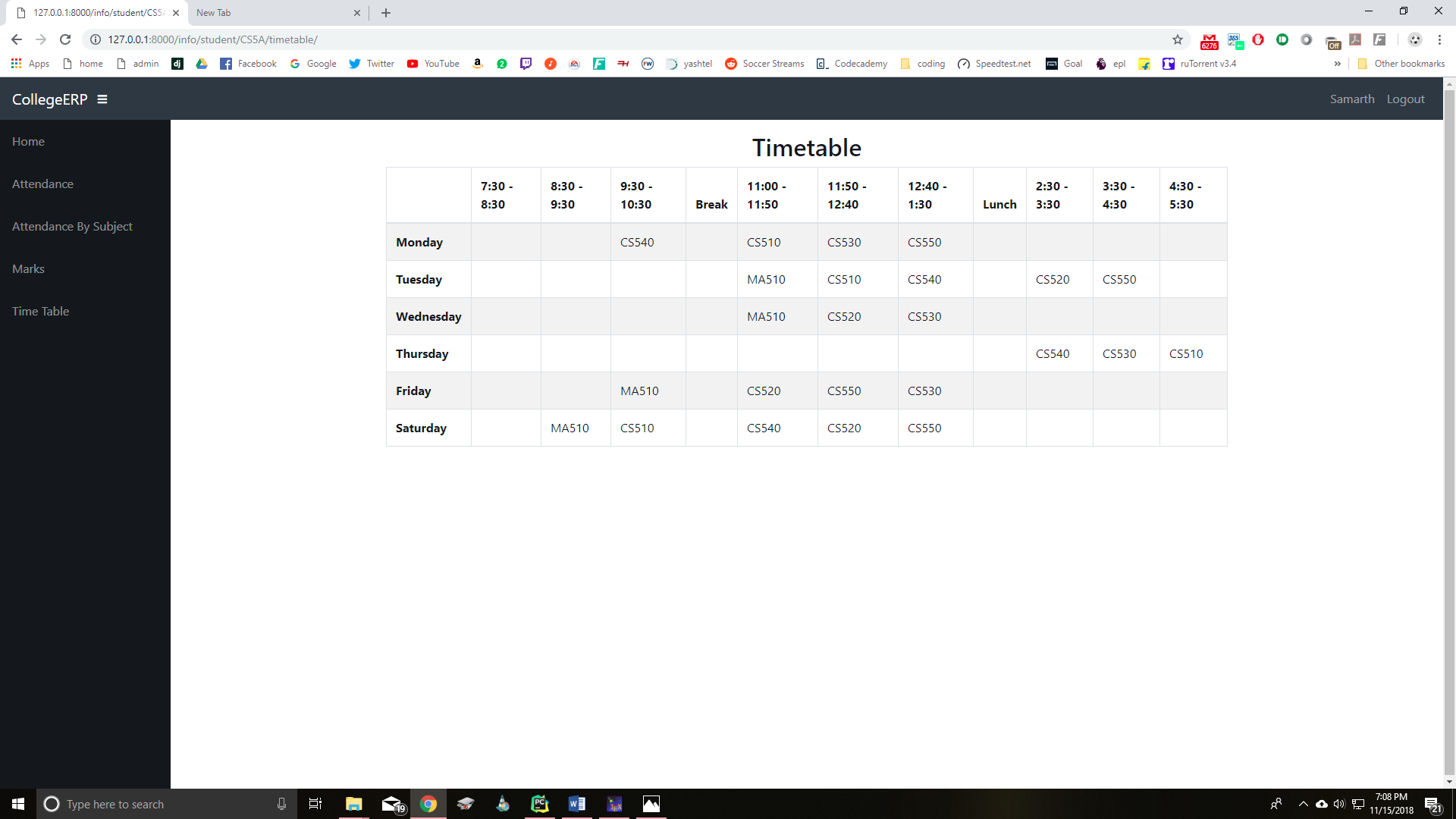 A college management system built using Django framework. It is designed for interactions between students and teachers. Features include attendance, marks and time table.