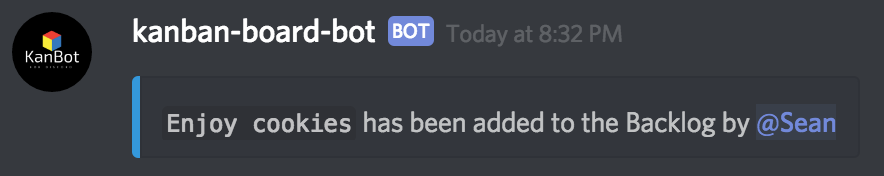 $kanbot -add "Enjoy cookies" to add to the backlog