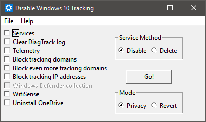A tool that I created to use some of the known methods of disabling tracking in Windows 10.