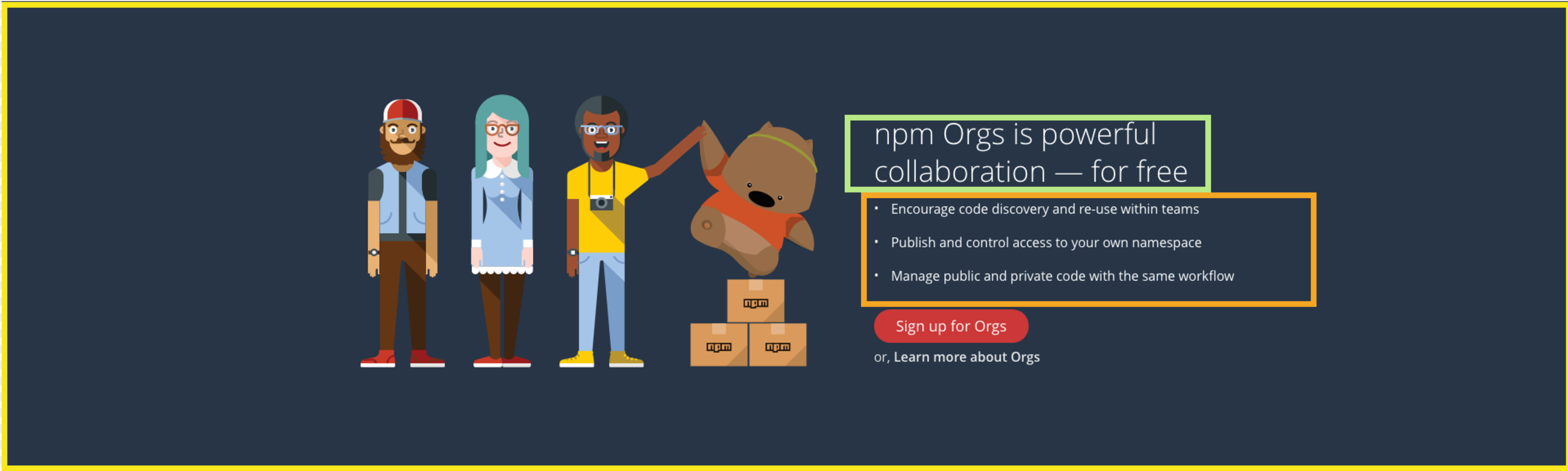 • First, split the section into 2 divs, one containing the heading and "The npm registry hosts...", the other containing the three different logos & their descriptions.