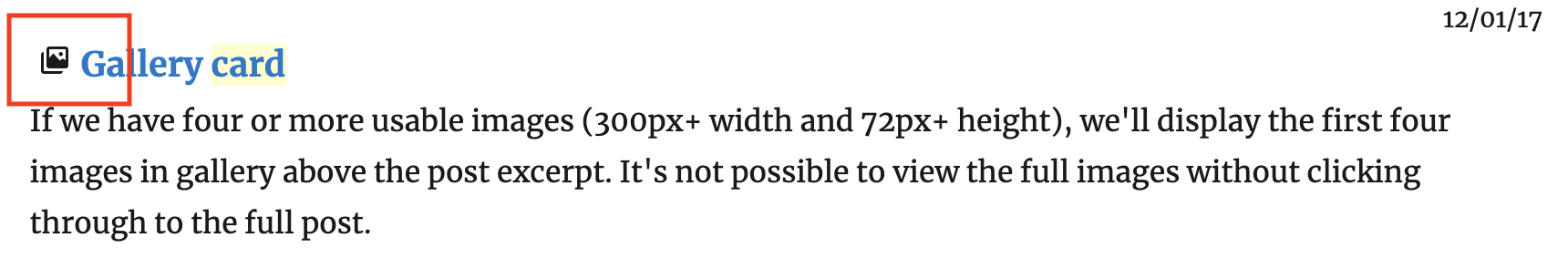 /?s=card&blog_id=84860689. Ensure that the multiple image icon is only presented when the post has a gallery.Proposed changelog entry for your changes: