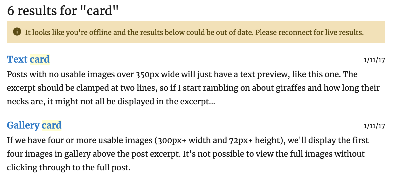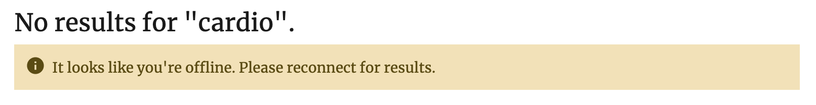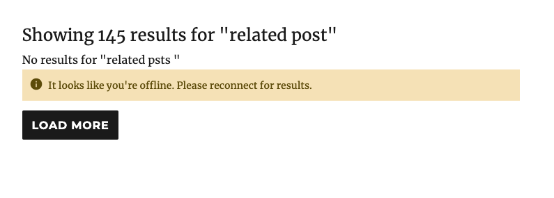 It tests out pretty well. I think we should add a Retry button inside the notice and shorten the messages a bit. Right now if you have cached results there is no way to retry once the device has gone online. It looks like right now we also have a way to trigger showing the "Load More" button when there are no results: