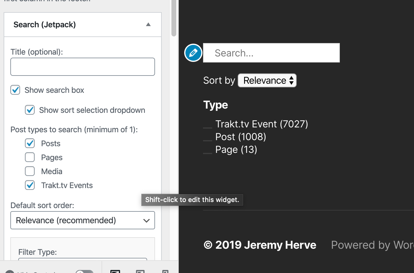 The theme is a child theme of Twenty Twenty, and I've added a Jetpack Search Widget in the footer.