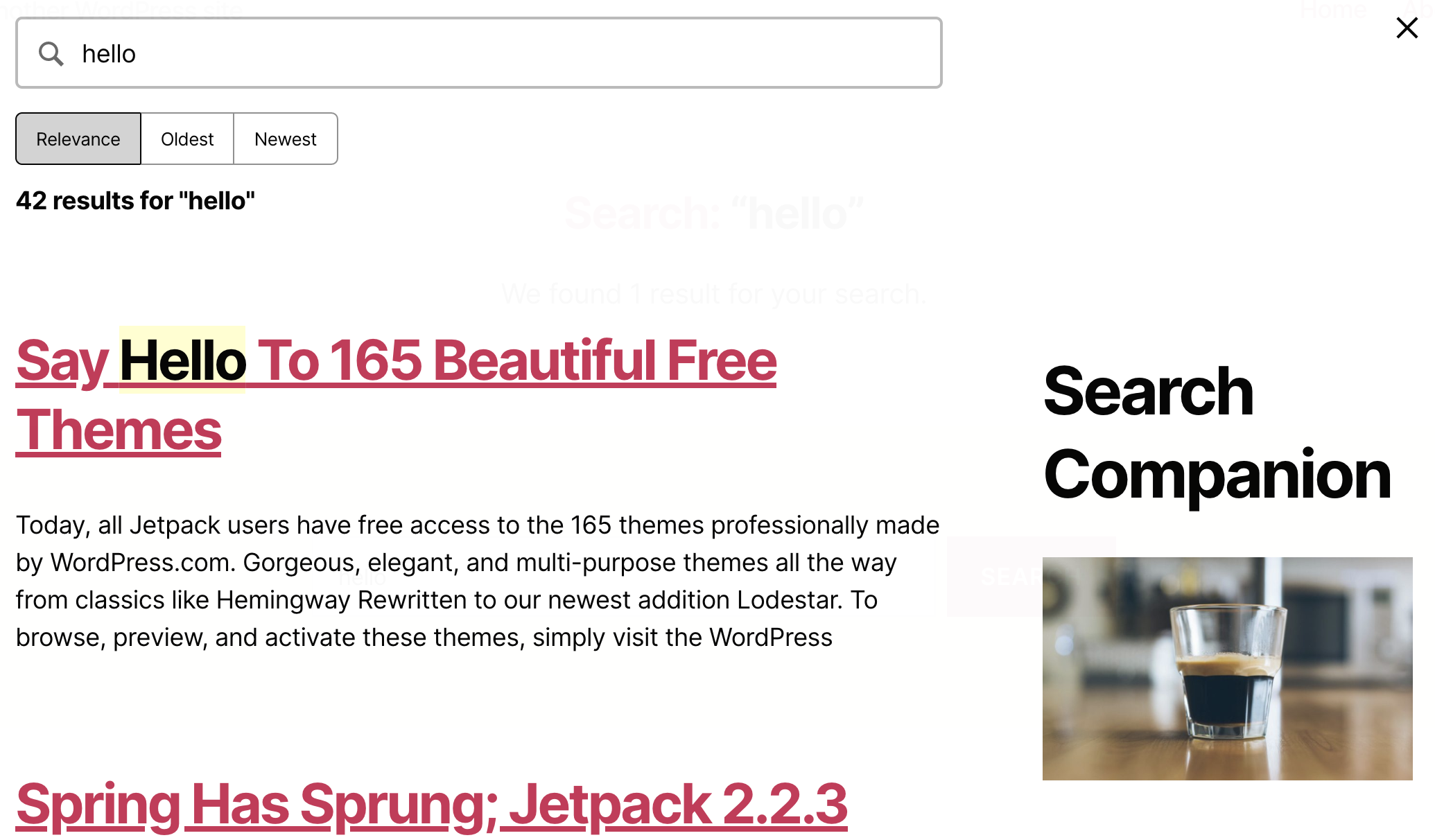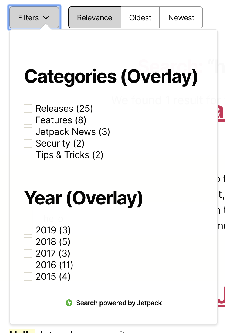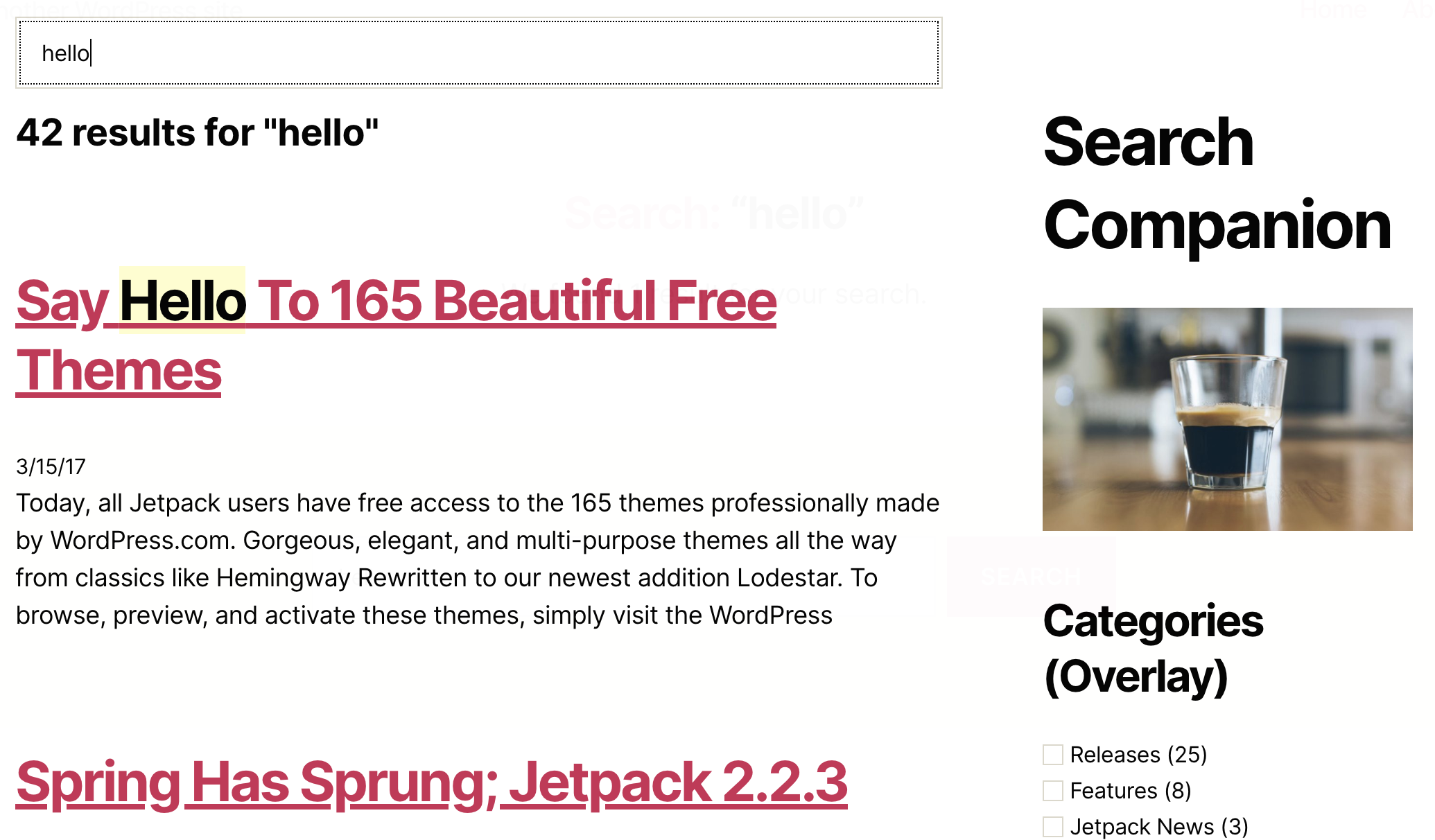 Follow these setup instructions to set up Jetpack Instant Search on your site. Please note that the Jetpack Search widget will need to be added to twice: once to your site sidebar/footer and once to the Jetpack Search Sidebar within the search overlay.