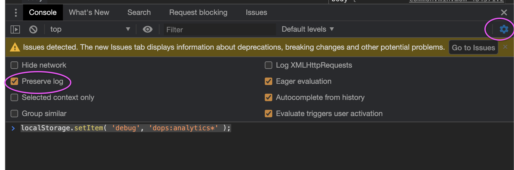 localStorage.setItem( 'debug', 'dops:analytics*' );ProTip: Preserv the log in order to see the second event when the redirect happens.