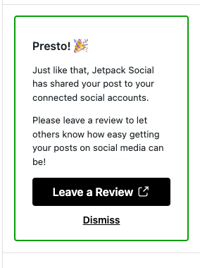 jetpack_social_plugin_review_prompt_view(recorded when review prompt is rendered)jetpack_social_plugin_review_prompt_new_review_click(recorded when "Leave a review" is clicked)jetpack_social_plugin_review_prompt_dismiss_click(recorded when "Dismissed" is clicked)Testing instructions: