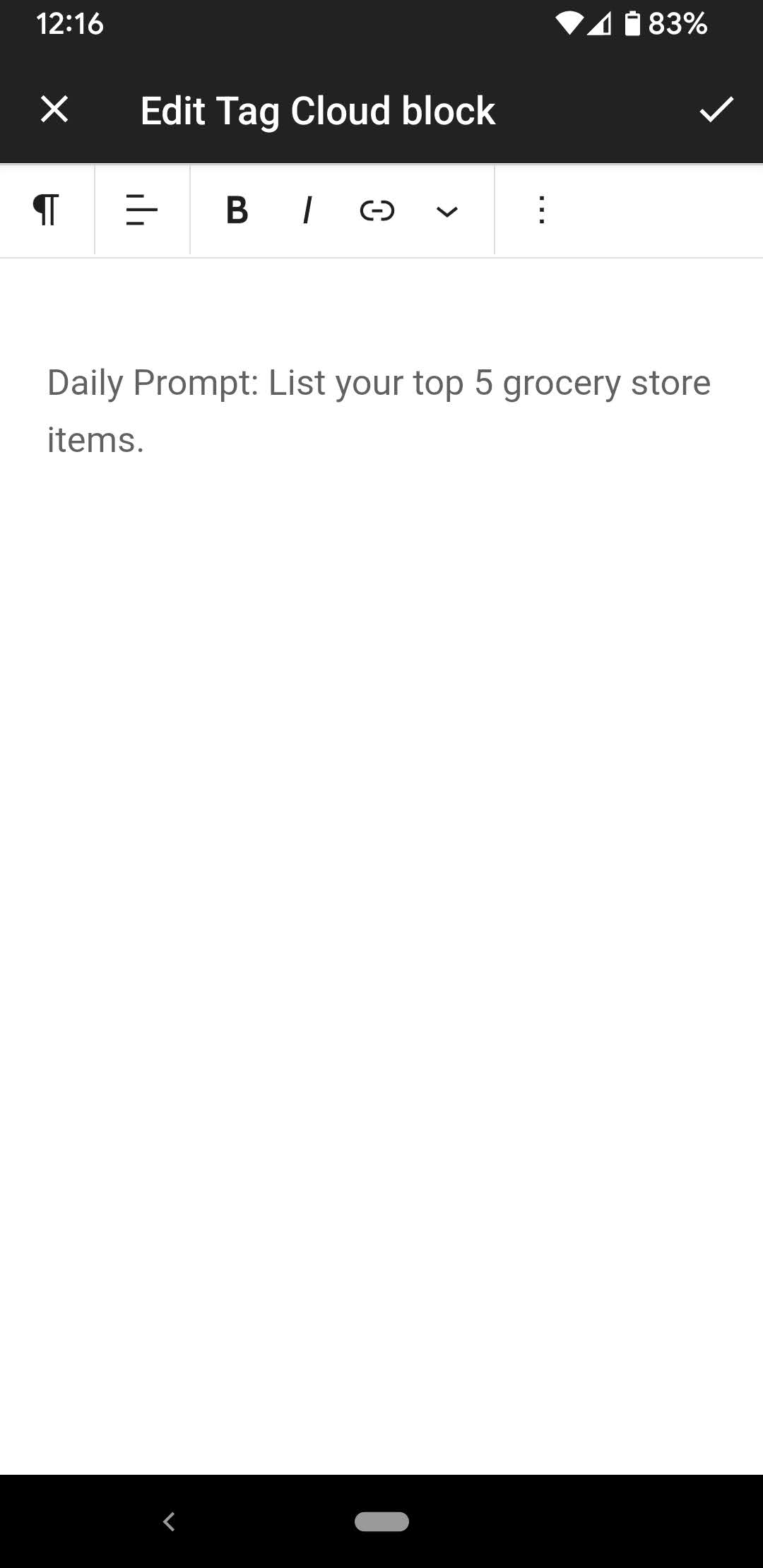 If a block is unsupported in the mobile app, a user can still edit it via a web view (known as the "Unsupported Block Editor" or "UBE"). Since the introduction of the blogging/writing prompts on WordPress.com, the block no longer loads within the UBE. The prompts display instead.