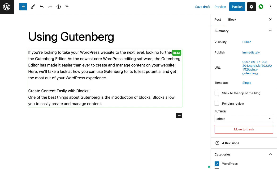 It will proceed to use Gutenberg core data bindings to grab title and categories it's being fed and generate a post intro based on this information.