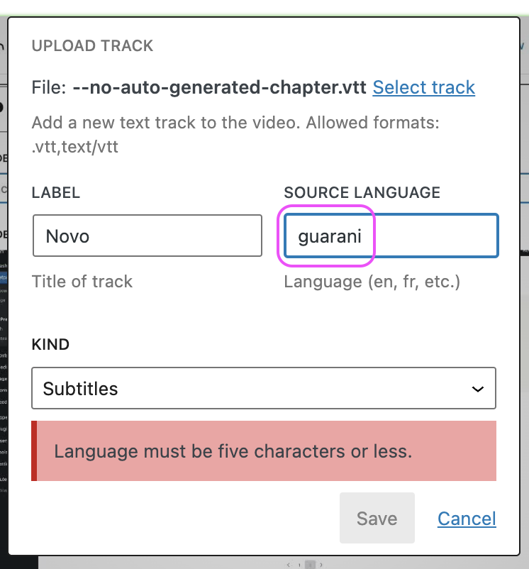 This PR looks at the source language length when uploading a new track for the video. When it's longer than five characters shows a notice error and blocks the