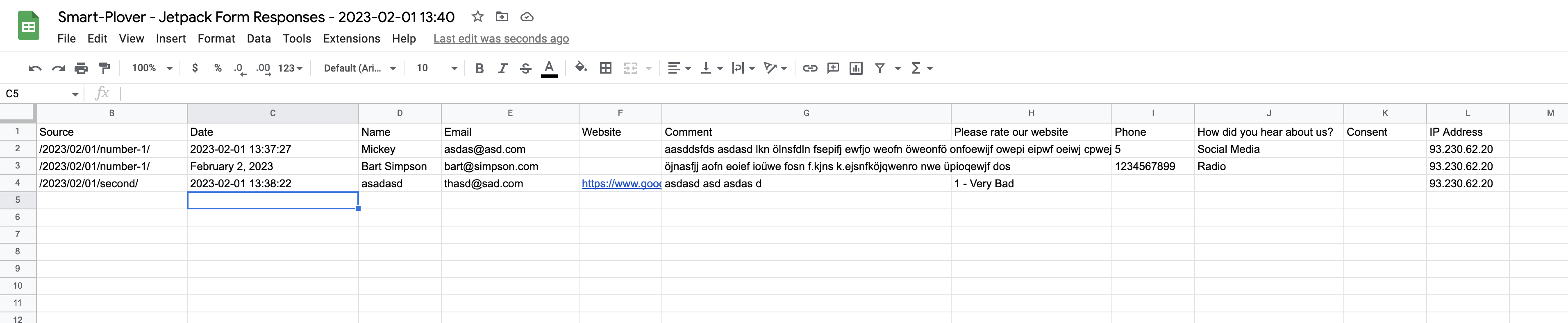 Go to "Feedback" menu on wp-admin and use the "Export" button. Both CSV or exporting to Google Sheets should show columns: