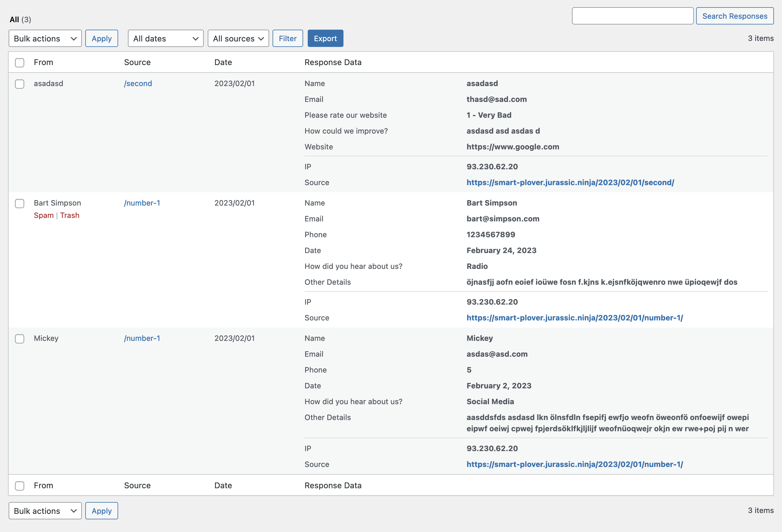 Use a site with some responses or create one, publish a post with a form and fill it a couple of times. Use multiple/different forms for fully testing the behavior.