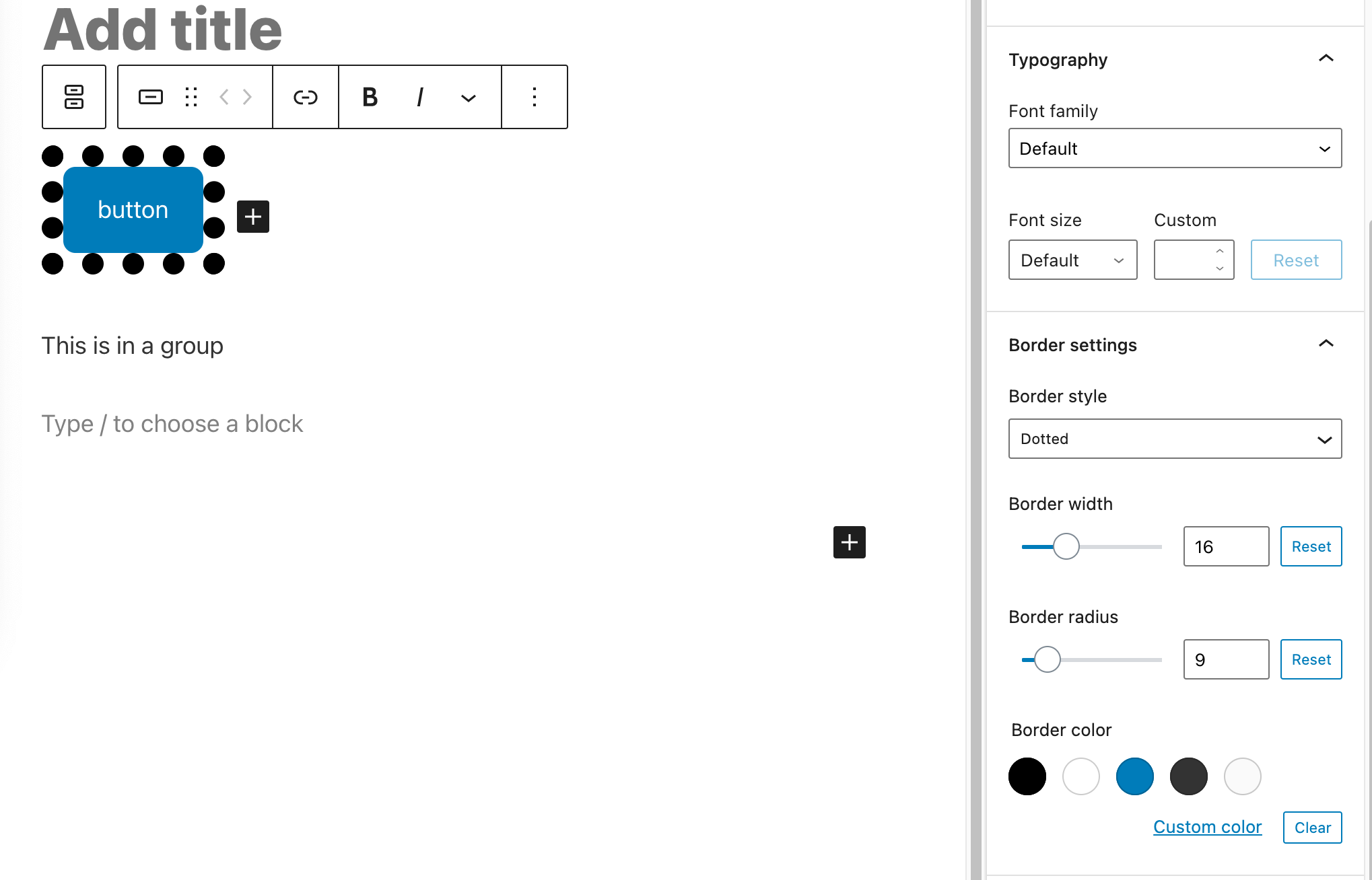 I pushed a change that allows what blocks express support to show the appropriate panels. Now the group block offers the controls. The button block, however, still doesn't express support for that in its block.json file. A quick test shows that adding it seems to work, giving the buttons the option too but I only gave it a quick glance. |