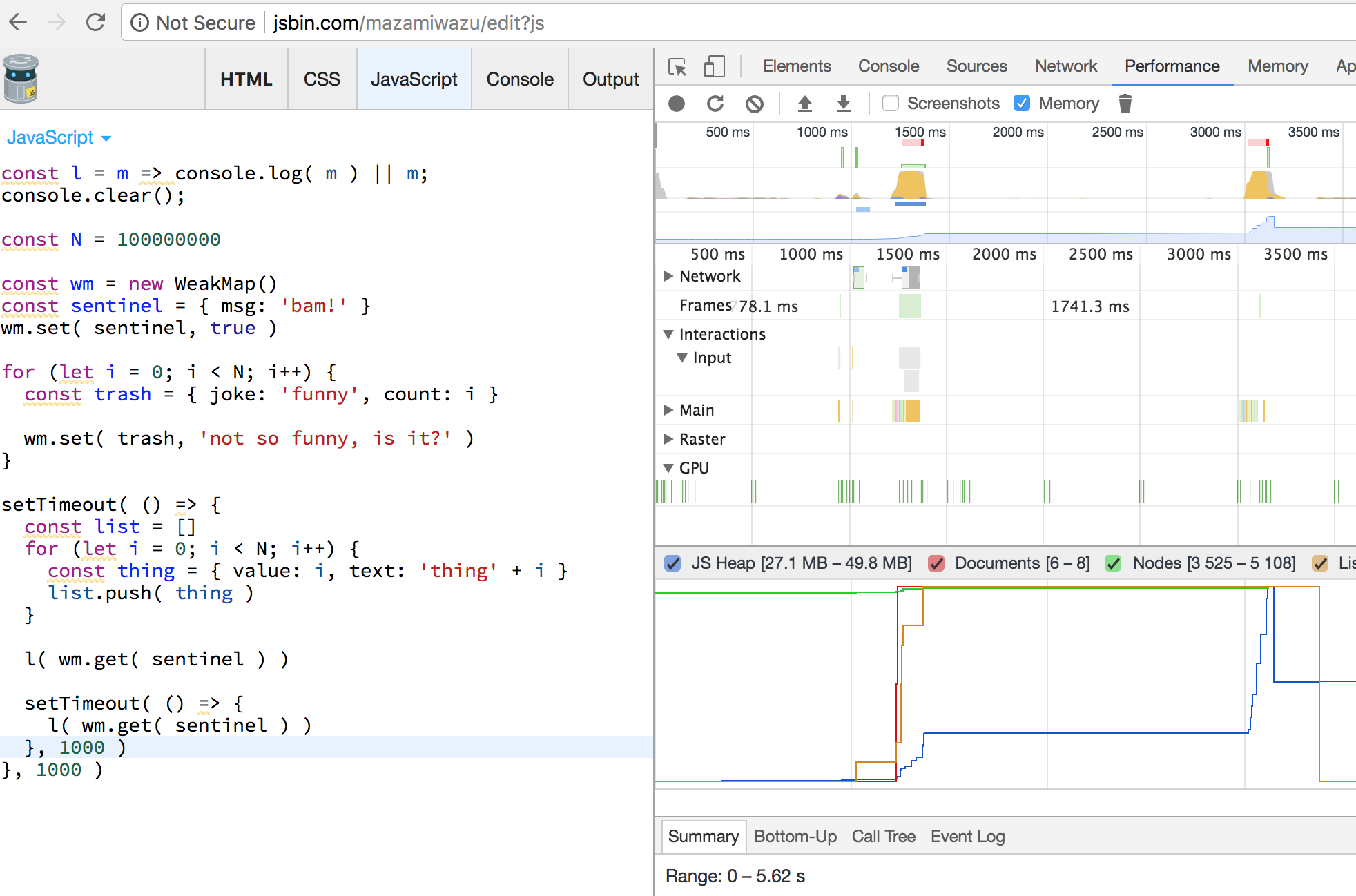 clearly I don't know what I'm doing here, but I tried to see if the weak map freed its local objects. in this ill-performed experiment i'm not sure what it indicates. but, the data is there for any more informed eyes