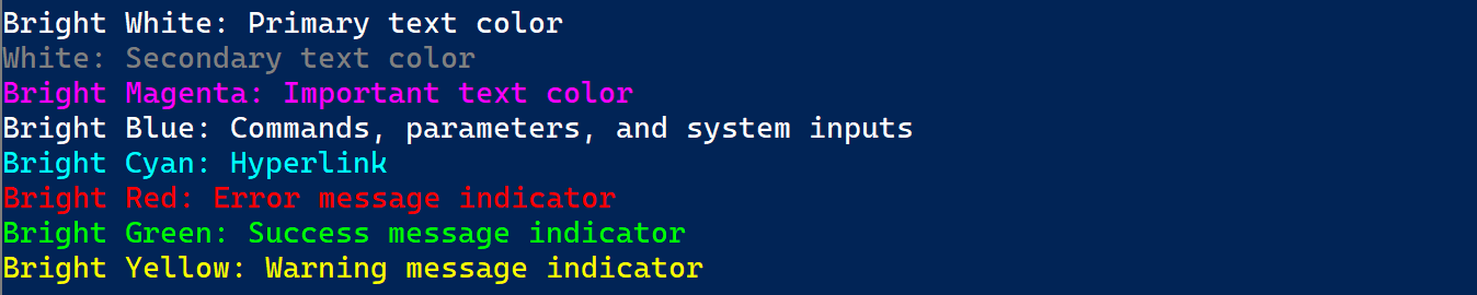 BRIGHT WHITEso that at least primary text is visible under both dark/light themesBRIGHT BLACKAdd light theme support which uses dark versions of colors. To try it, in light/dark-themed terminals, run