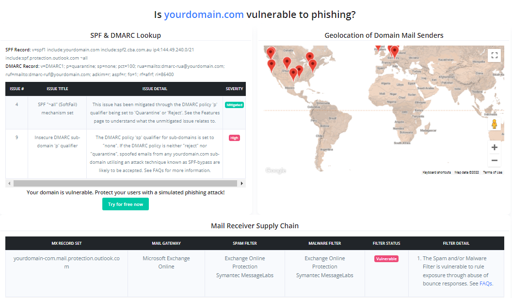 The automated scan adds an orchestration layer whereby Phishious automatically sends emails, ingests bounce responses and analyses mail headers with only a few clicks. The main exercise on you as the user is to identify vulnerable mail receivers.
