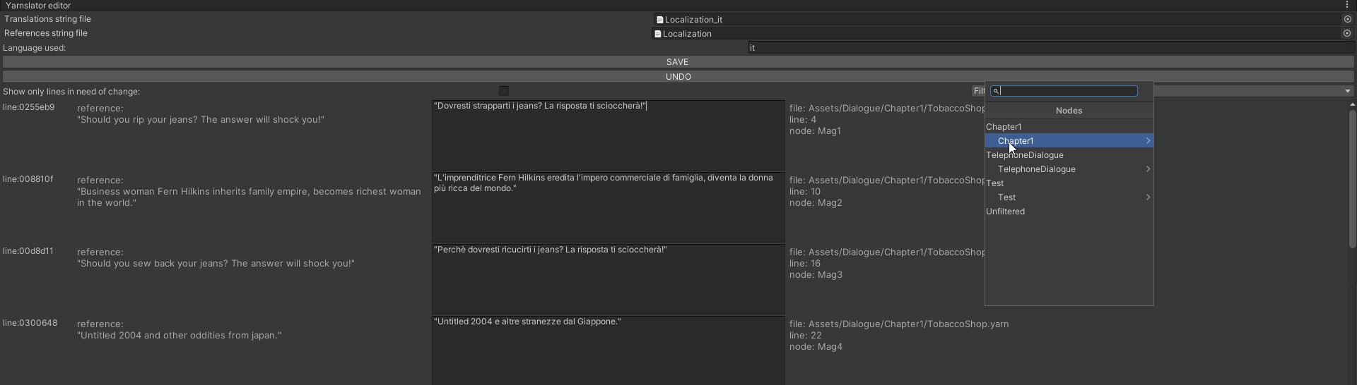 -(optional) toggle the "Show only lines in need of change" button to only show lines marked by yarn spinner with (NEEDS UPDATE)