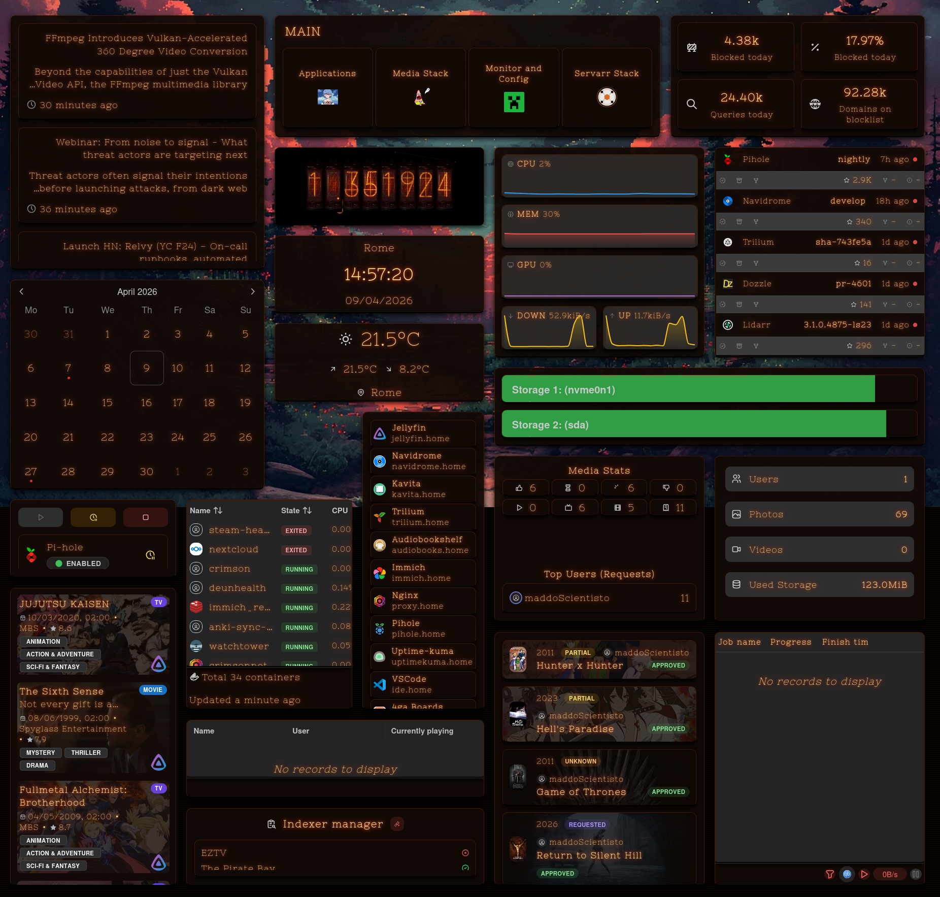 - Media and automation: Radarr, sonarr, lidarr, prowlarr, qbittorrent, jellyfin, navidrome, and audiobookshelf.