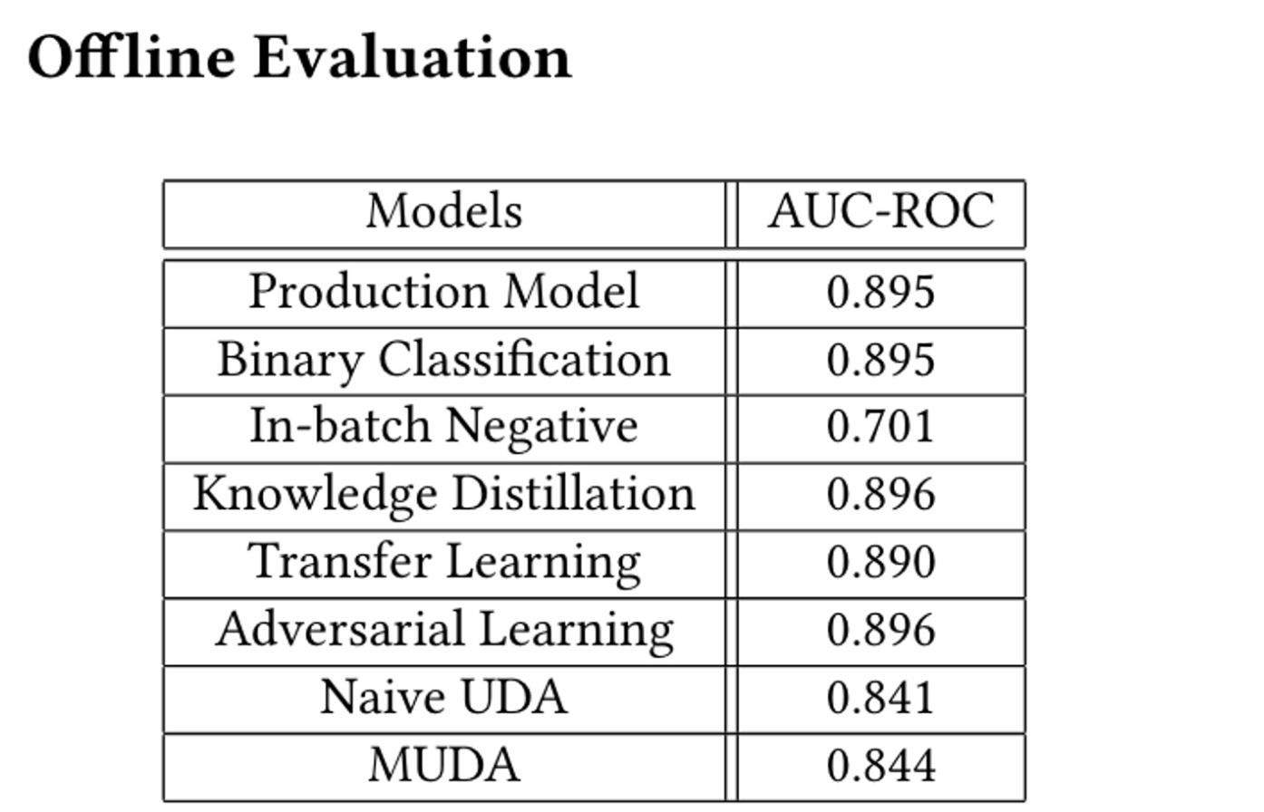 离线评测结果中,和线上基线相比,二分类、蒸馏、迁移学习,对抗学习的AUC都差不多,因为他们都包含了曝光样本集合的训练,batch内负采样AUC很低,因为没有用真实负例去训练,UDA类的方法比基线低一些原因是仅在unbiased dataset上训练,评估集则是曝光样本集合。