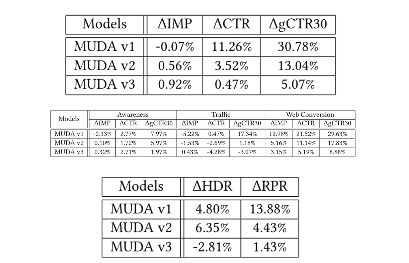 HDR和RPR是两个业务指标,一个是广告隐藏率,一个是广告的re-pin率。虽然RPRdou增加了,但v1和v2模型都推荐了更多将被用户隐藏的广告,这表明这些模型推荐的一些广告并没有为用户提供良好的体验。相比之下,MUDA v3模型通常在所有指标中具有最平衡的改进,这表明用户参与度的积极提升和不需要的用户体验(HDR)的减少。
