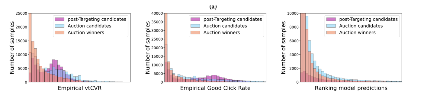 为了实锤这一问题,作者构造了三份天级别的数据集,来分析候选的后验转化率、点击率以及排序模型预估分在不同阶段候选的分布。第一个是post-Targeting Candidates,也就是召回模型在serving时的实际打分对象(被称为unbiased dataset),第二个和第三个则是召回模型的训练集来源(称为biased dataset)。实际在构造天级别的unbias dataset时,考虑到性能问题,每天采样10w个query,以及每个query采样6k个候选,并采用排序模型预估值作为伪标签。从上图可以看到不同阶段的候选的分布明显的差异,即存在样本选择偏差现象,特别是用于召回模型学习的排序预估值分布不一样。