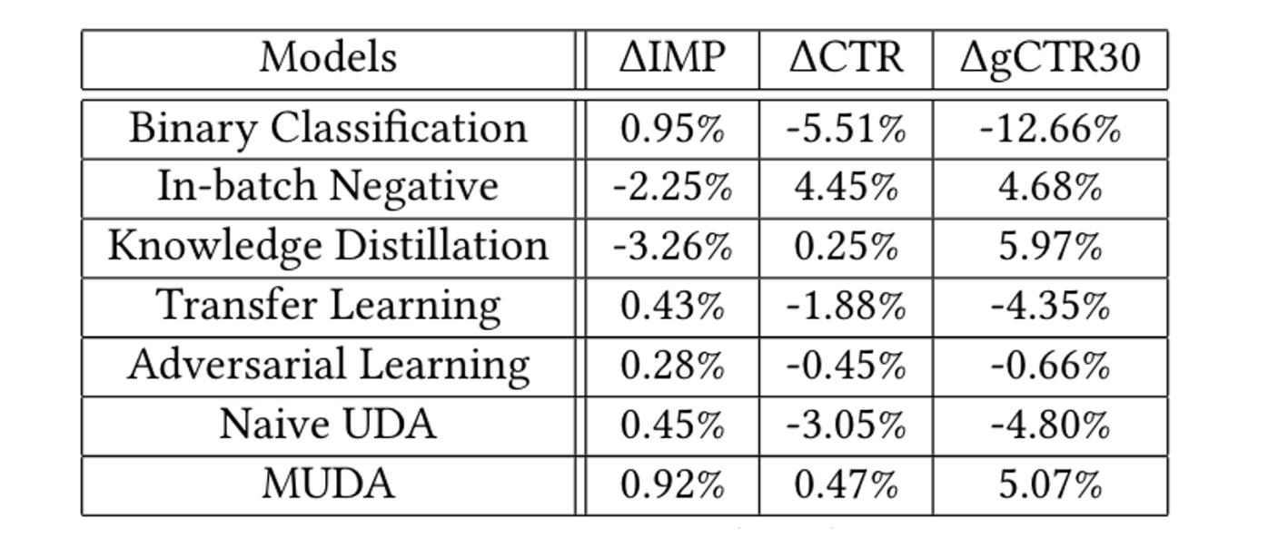 Awareness是指知名度,Traffic是流量,web conversion则是指转化。batch内负采样模型在知名度广告上的点击提升是因为展现数的大量减少。知名度广告这种主要是提高品牌知名度的,本身点击就比其他类型的广告少,而batch内负采样都是在点击正例上训的,自然对这种广告不友好。流量广告则是为了提升知名度,挖掘潜在客户,推动转化。而batch内负采样模型在这种类型广告上取得了一致的提升,还是因为它的训练集都是一些高点的交互pair,所以挖掘的广告倾向于吸引高点记录的用户。MUDA在转化广告方面取得了最高的一致性提升,因为学的排序预估分可能倾向于高转化的,同时分桶策略也进一步促进了更高转化质量的广告候选的挖掘。