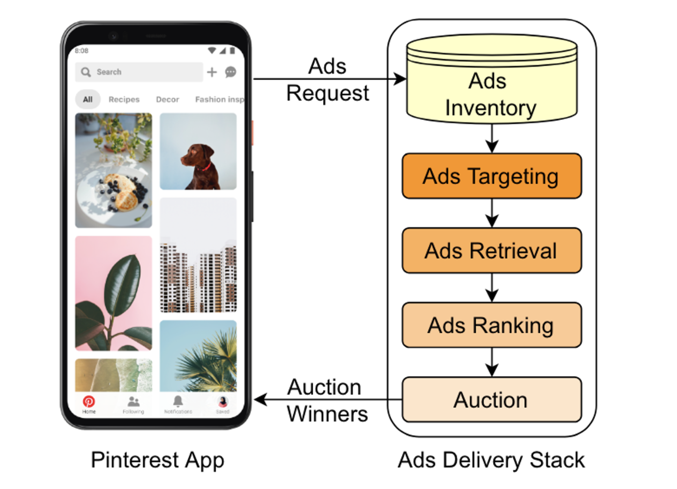 Pinterest广告漏斗分为Ads Targeting, Ads Retrieval, Ads Ranking和Ads Auction四个阶段,首先通过定向模块圈选出符合广告主要求的数百万候选,而后通过召回、排序模块进一步过滤,最后经过拍卖模块返回十几个真正展现给用户的物料。
