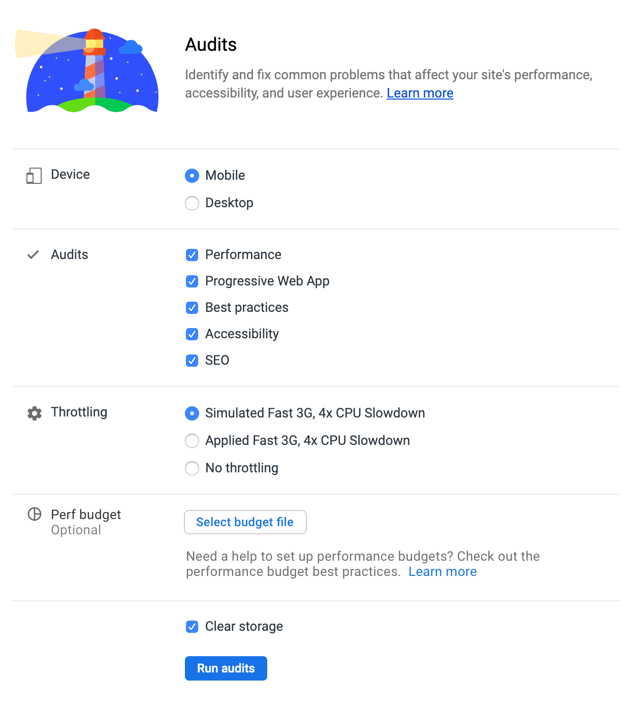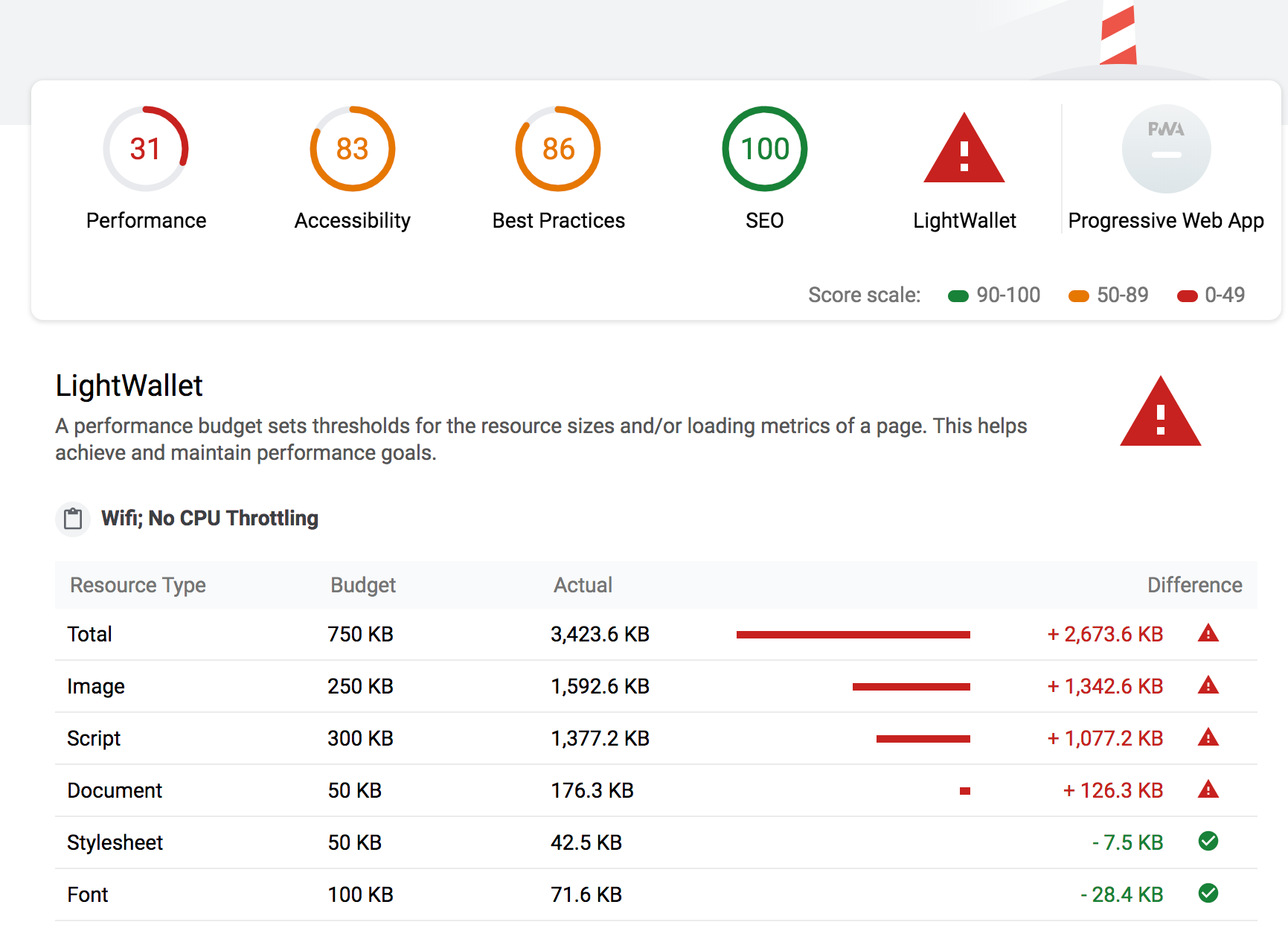 LightWallet is run as a part of Lighthouse and requires no configuration. Out of the box LightWallet will use a default performance budget (which is based on page weight) to audit a page.