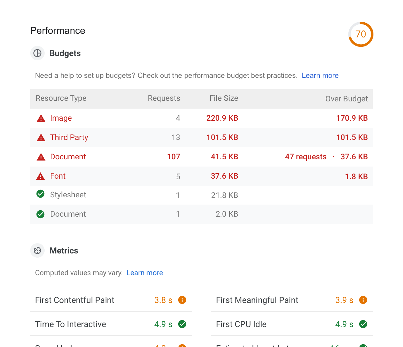 { "budgets": [ { "cpuThrottling": 4, "connectionType": "slow3G", "pageWeight": [ { "resourceType": "script", "budget": 100 }, { "resourceType": "image", "budget": 50 }, { "resourceType": "stylesheet", "budget": 10 }, { "resourceType": "document", "budget": 20 }, { "resourceType": "font", "budget": 0 }, { "resourceType": "thirdParty", "budget": 20 } ], "timings": [ { "metric": "firstCpuIdle", "budget": 4000, "tolerance": 1000 }, { "metric": "timeToInteractive", "budget": 5000, "tolerance": 1000 }, { "metric": "firstMeaningfulPaint", "budget": 2000, "tolerance": 500 } ] }, { "cpuThrottling": 1, "connectionType": "wifi", "requests": [ { "resourceType": "total", "budget": 100 }, { "resourceType": "thirdParty", "budget": 0 } ] } ] }Result: