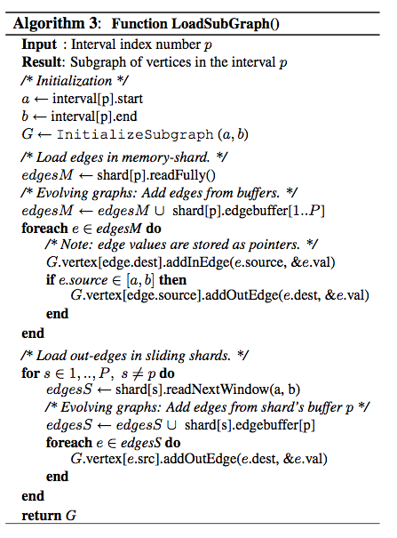 PSW does graph computation in execution intervals, by processing vertices one interval a time. To create subgraph of the vertices in interval p , edges (with their associated values) must be loaded from disk. First, Shard(p), which contains the in-edges for the vertices in interval(p), is loaded fully into memory. We call thus shard(p) the memory-shard. Second, because the edges are ordered by their source, the out-edges for the vertices are stored in consecutive chunks in the other shards, requiring additional P-1 block reads. Importantly, edges for interval(p+1) are stored immediately after the edges for interval(p). Intuitively, when PSW moves from an iteration to the next, it slides a window over each shard. We call the other shards the sliding shards. Note, that if the degree distribution of a graph is not uniform, the window length is variable. In total, PSW requires only P sequential disk reads to process each interval. A high-level illustration of the process is given in Figure , and the pseudo-code of the subgraph loading is provided in Algorithm 3.