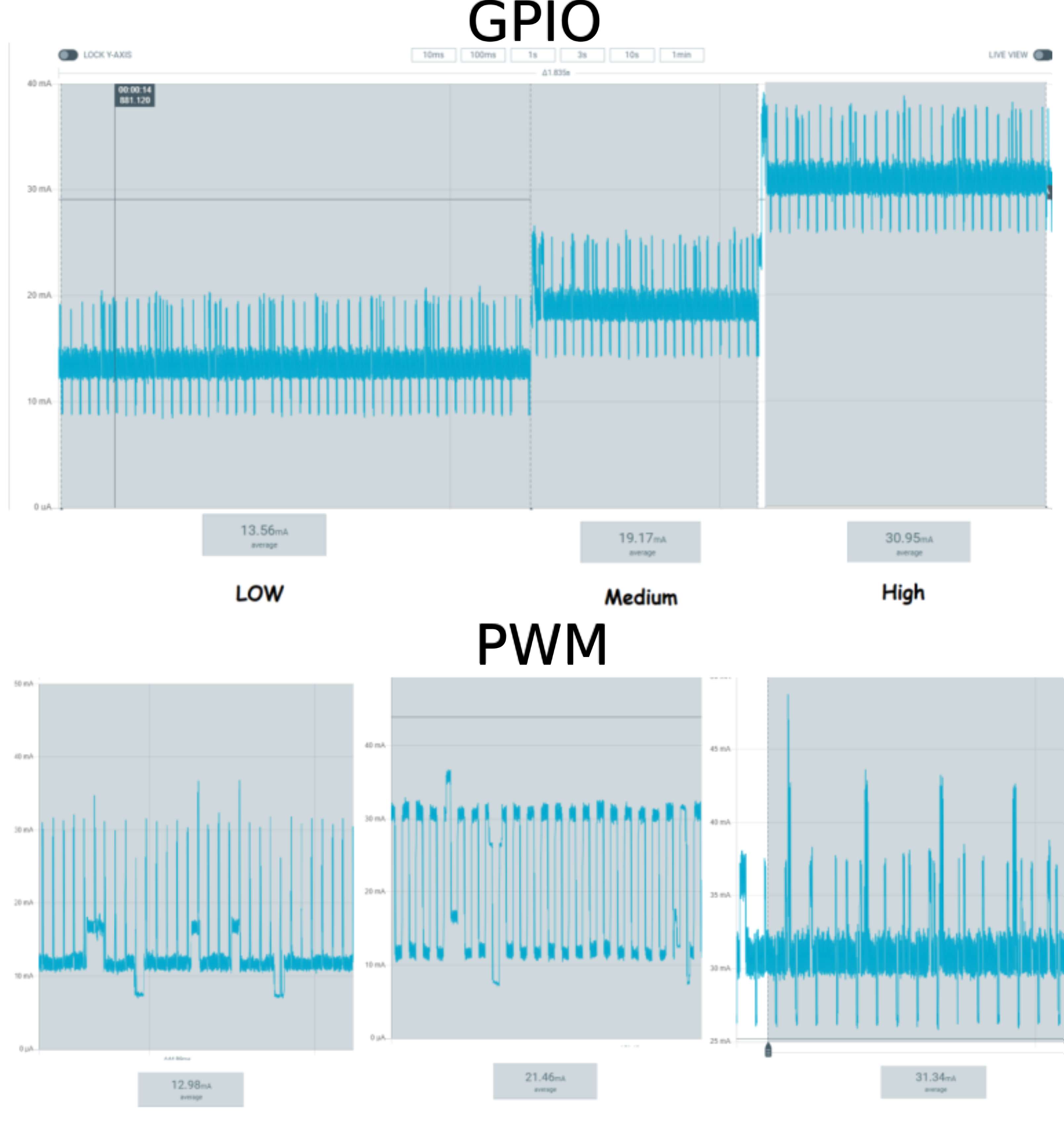 @geekbozu did a measurement on nrf PPK2. It seems that values are quite similar. However I must optically verify that PWM value for low/med looks the same as the gpio settings. Then we might measure again. However in high the pwm duty cycle is 100% on, and there is 0.4 mA error based on some spikes the FreeRTOS/BLE is doing between gpio/pwm mode. So I'm not sure we could compare gpio and pwm perfectly, there will be like 0.5ma measurement error at least. |