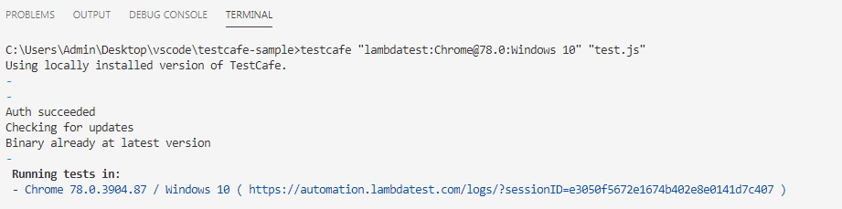 C:\Users\Admin\Desktop\vscode\testcafe-sample>testcafe "lambdatest:Chrome @85.0:Windows 10" "test.js"