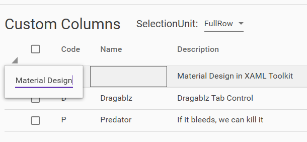 DataGridAssisttype I could see that there previously was some issues with correctly displaying/highlighting the selected cell/row depending on theDataGrid.SelectionUnitproperty, so I added options to change that from the UI of the demo tool and also ensured that things work the way I think the user would expect it to.There is a slight "funkyness" to the behavior that we start editing on single-click. This means that once editing is started and you press Tab to jump between the cells, the next cell also enters edit mode. However, you can use ESC to exit edit mode, and then you can use Tab to simply jump between the cells without activating edit mode. It is quite obvious why it works that way seen from the code, I am just wondering about the UX perspectives of those two different experiences using the Tab key.