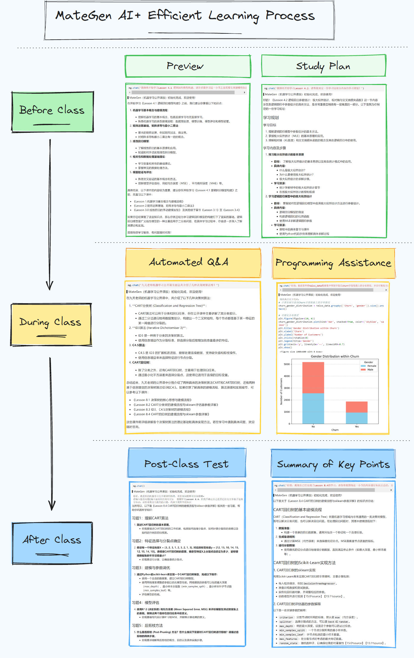 Based on MateGen's powerful capabilities in massive text retrieval and Q&A, as well as its coding abilities, a MateGen equipped with a knowledge base of course materials can fully function as an intelligent teaching assistant. Before learning, it can assist users with pre-study preparations and create study plans. During learning, it can provide 24/7 real-time Q&A support, helping users with programming or other coding tasks anytime. After class, it can generate exercises based on users' questions during the course, analyze weak points in their knowledge, and compile them into review documents for post-class revision.
