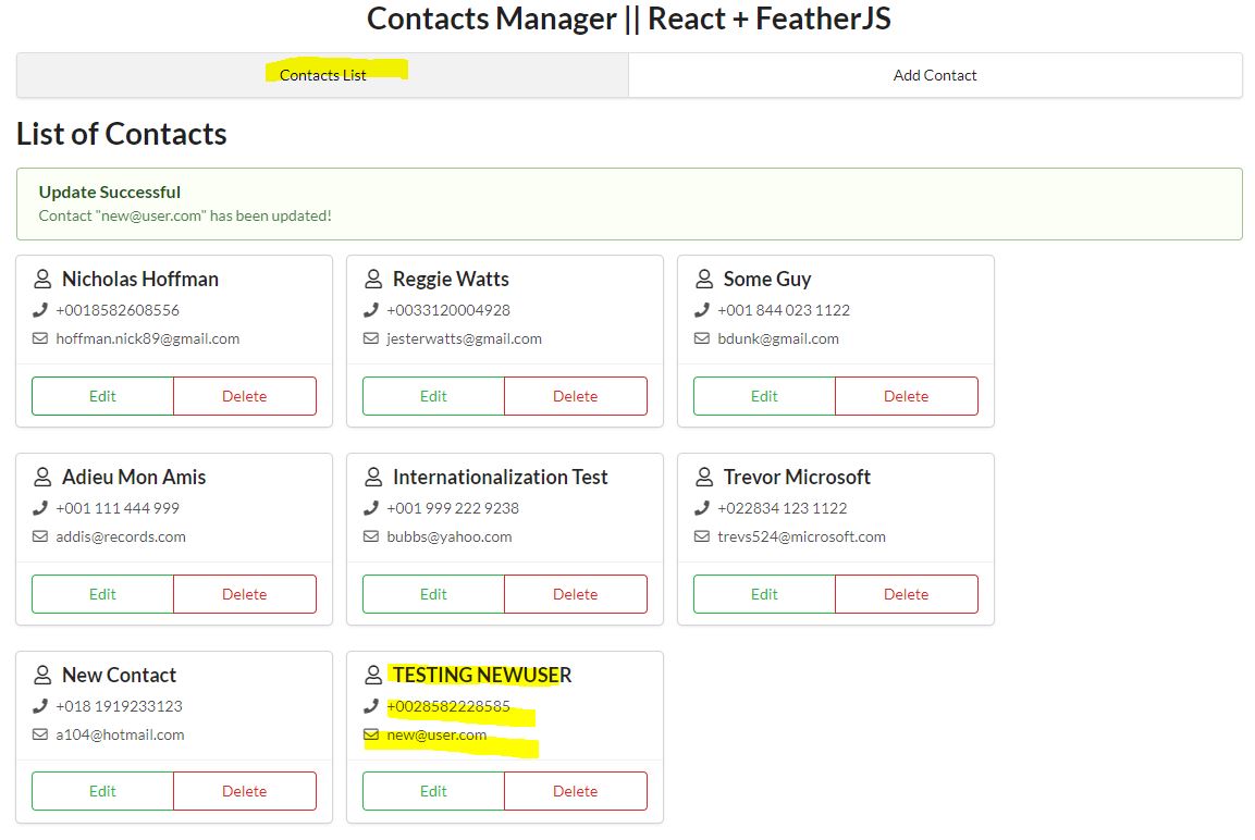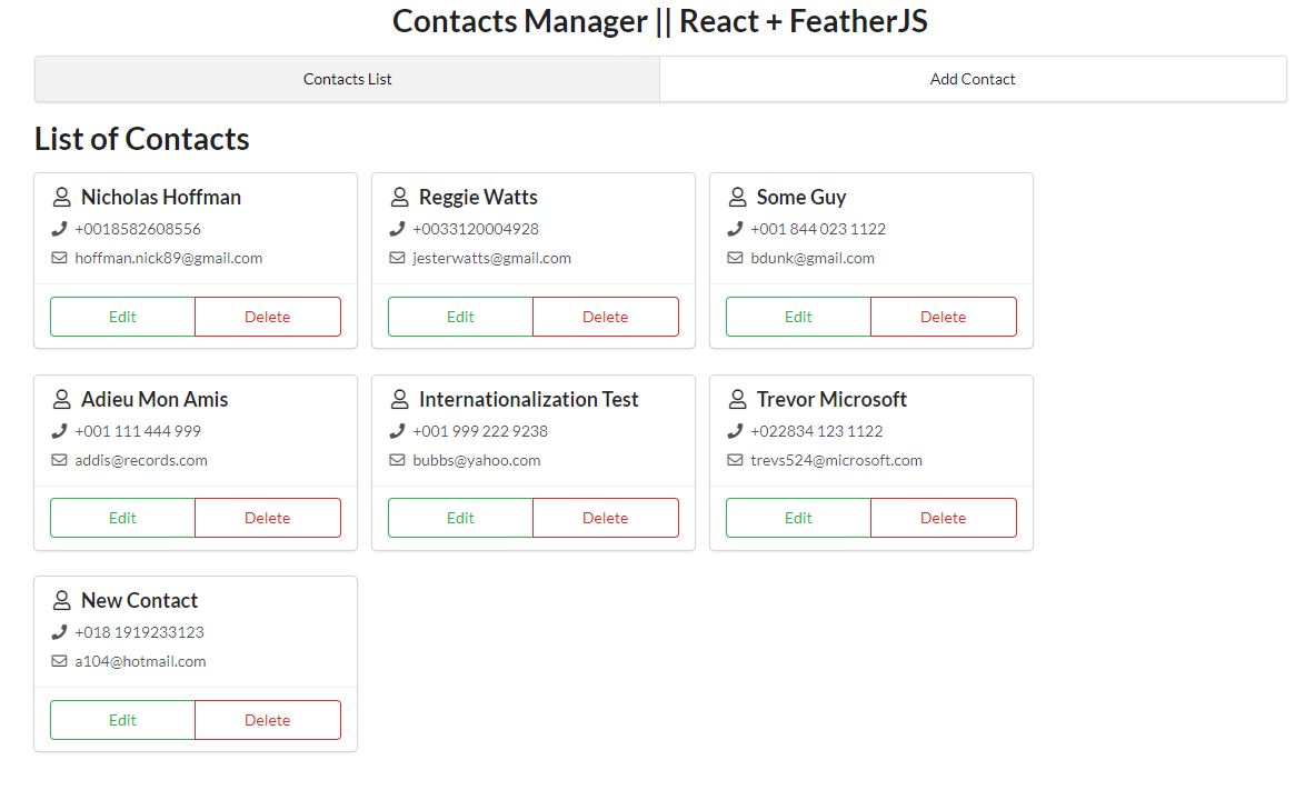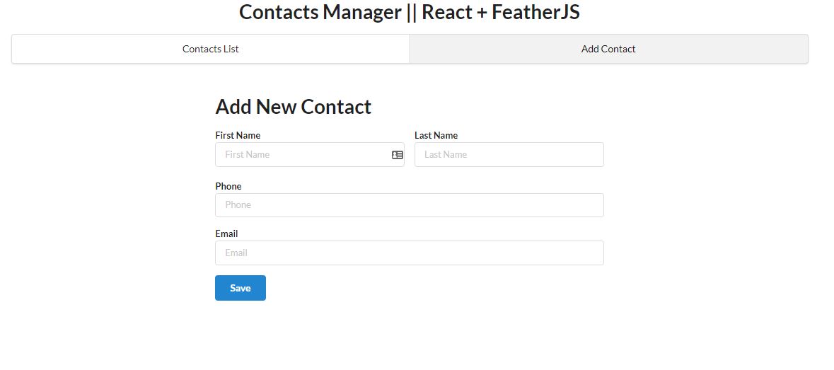 Project: "Contacts Manager || React + FeatherJS" This project uses Feathers. An open source web framework for building modern real-time applications. The code allows you to add new contacts to your Contact Manager.