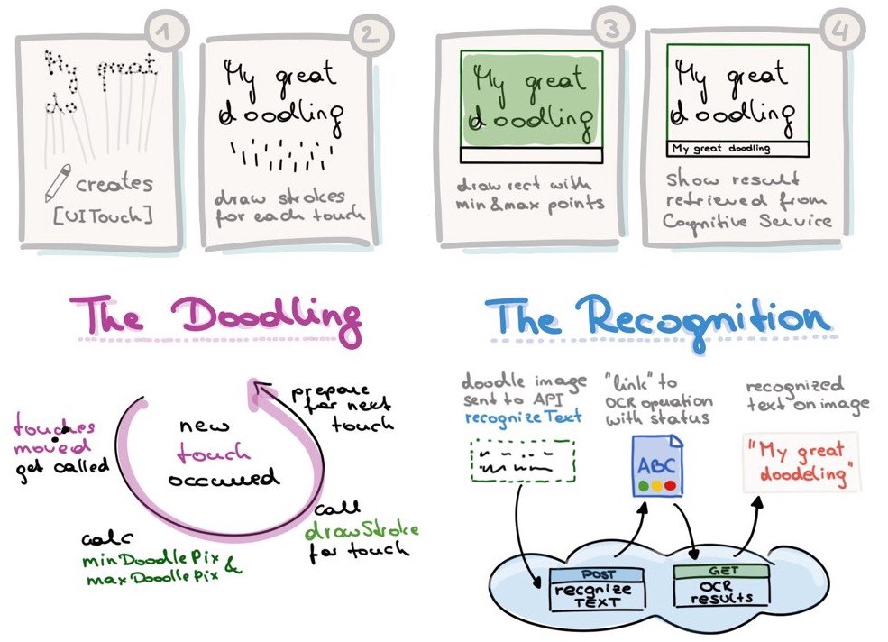 The second part is wrapped in the CognitiveServices.swift file, where two API calls are needed for getting the handwritten text within an image recognized. First you send the image to the textRecognition endpoint and get an operation_location URL back. Because the recognition can take a while, you are able to check back with this URL if the processing is already finished. If the status in the response is SUCCESS, the function just takes the result out of the text array and displays it right under your doodled text.
