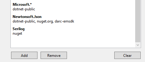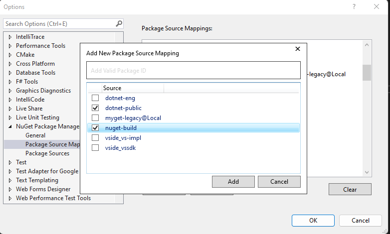Package Source Mappingoptions dialog, and toAdd,Remove, orClearmappings. Here is a screenshot of this dialog showing the mappings for NuGet.sln:When a user clicks