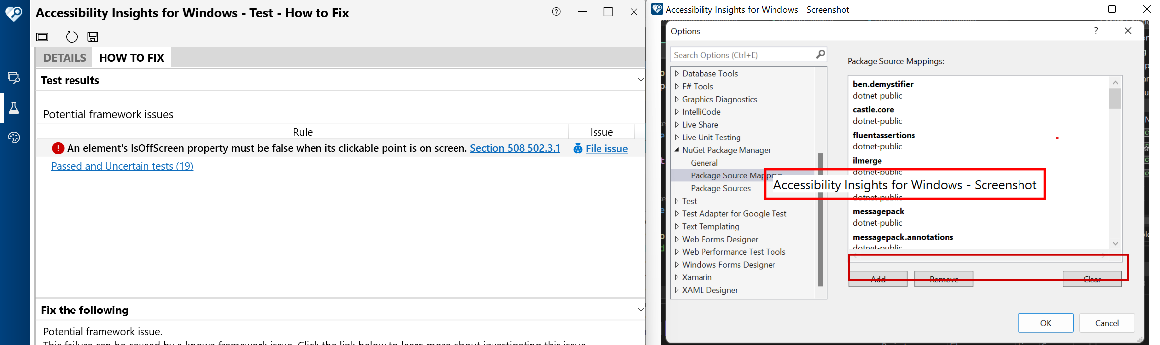 ListViewshowing the package source mappings in thePackage Source Mappingsoptions dialog shows the wrong value for theIsOffScreenproperty for mappings not in view. This issue appears in other VS options dialogs that have aListViewand is mentioned in this issue: Inconsistent UIA IsOffscreen and ClickablePoint properties for WPF ListViewItems that are scrolled out of view dotnet/wpf#4631 , so I decided not to fix it.