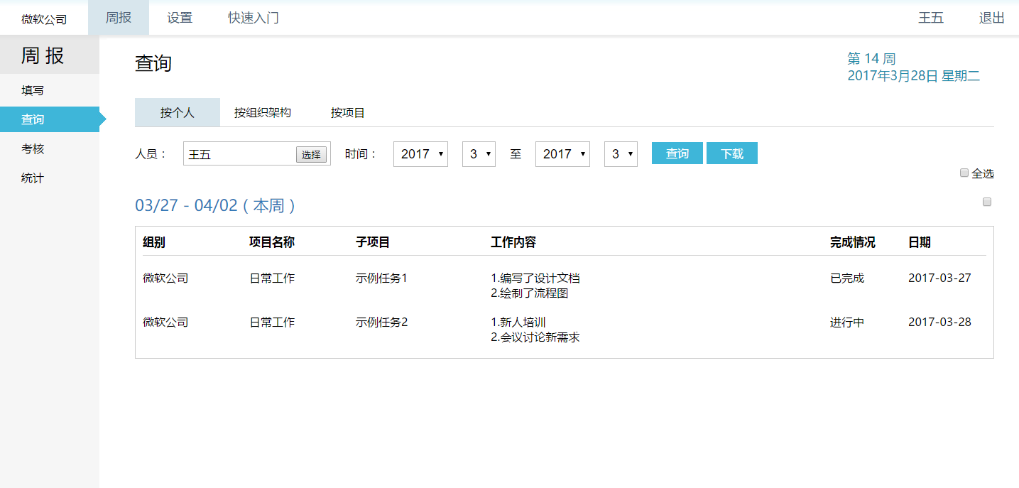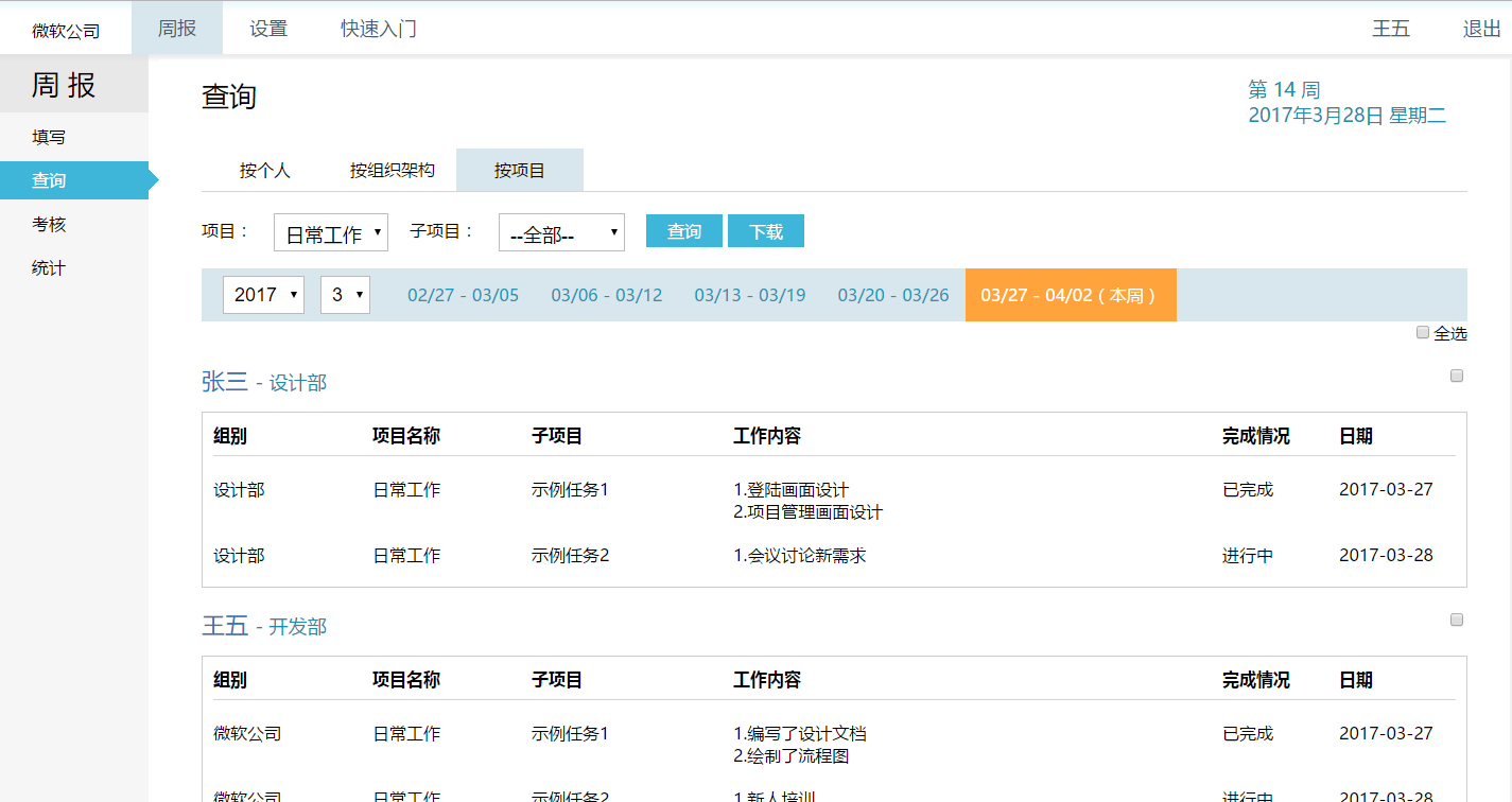 - 可按个人、按组织架构、按项目将周报内容导出Excel文件。