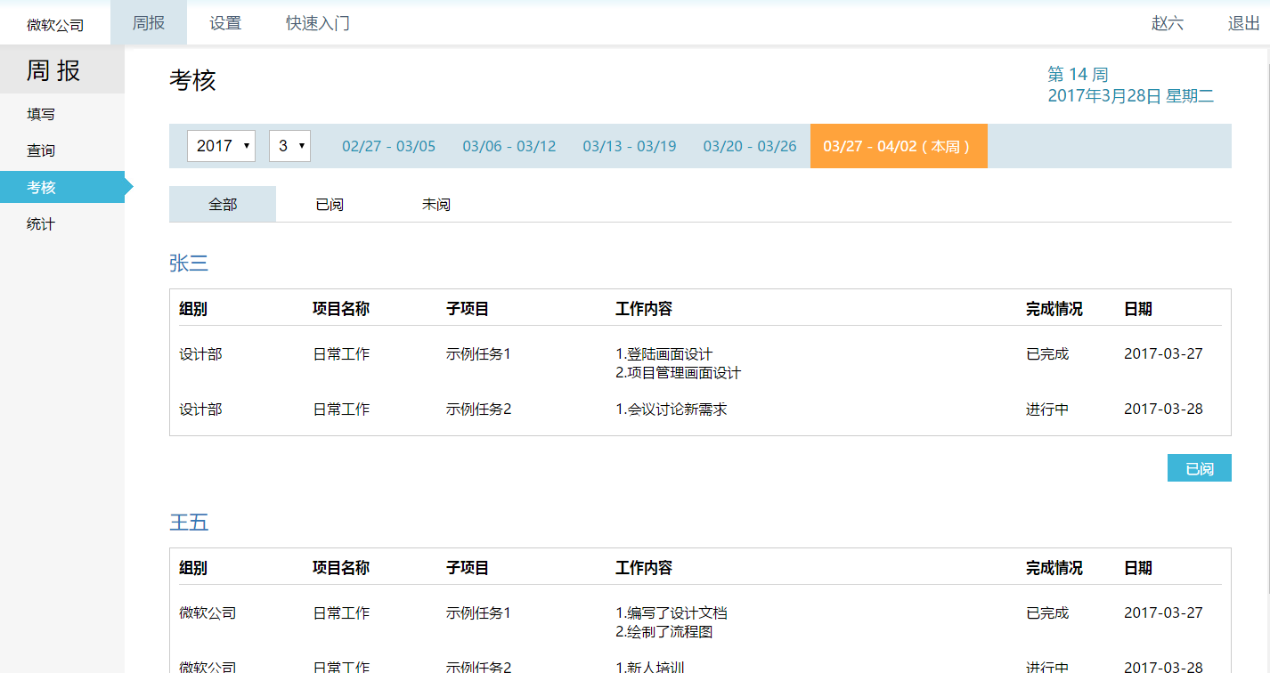 - 有考核权限的人,可以对被考核人的周报设置“已阅”状态,“已阅”状态的周报不可再修改。