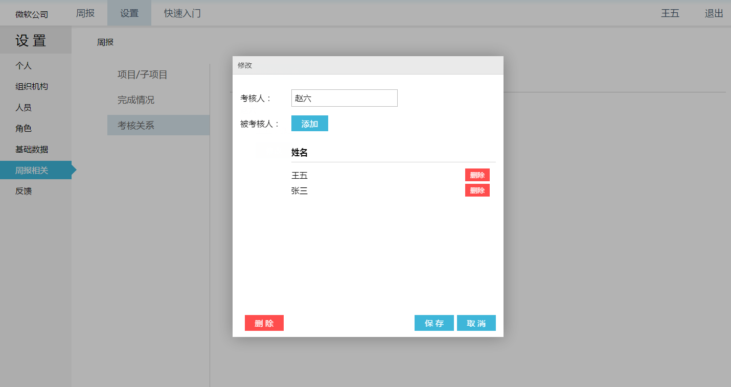 - 人员管理,可将人员关联到不同的项目中,使之只能填写及查询所属项目的周报。