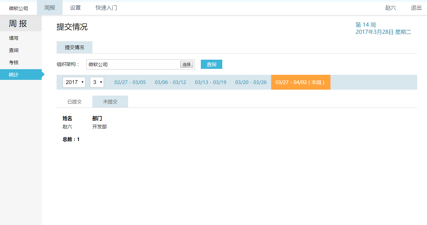 - 按组织架构统计哪些人已提交,哪些人未提交。