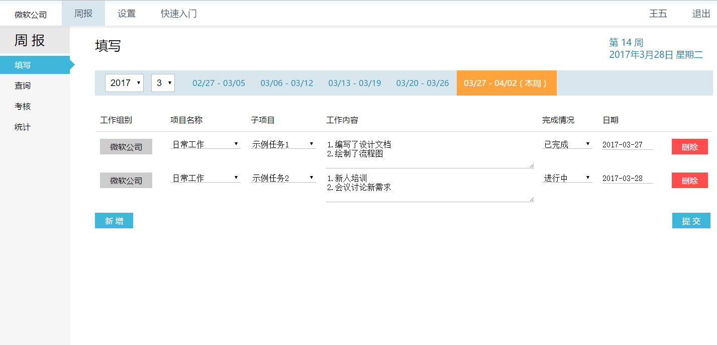 - 以周为单位填写,可以切换年月和周次,可以填写多条并指定周次内的日期。填写时可关联到项目/子项目以便后续查询。