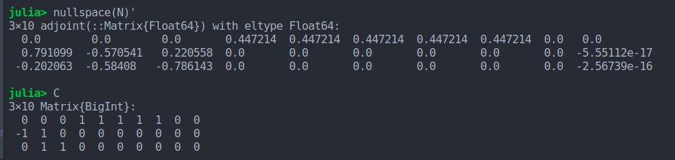 matrix. Following is the nullspace estimate from rational basis perspective, meaning the way we would have done to calculate nullspace had we done it by hand. (Code logic taken from null.m in MATLAB and used RowEchelon.jl library to obtain rref