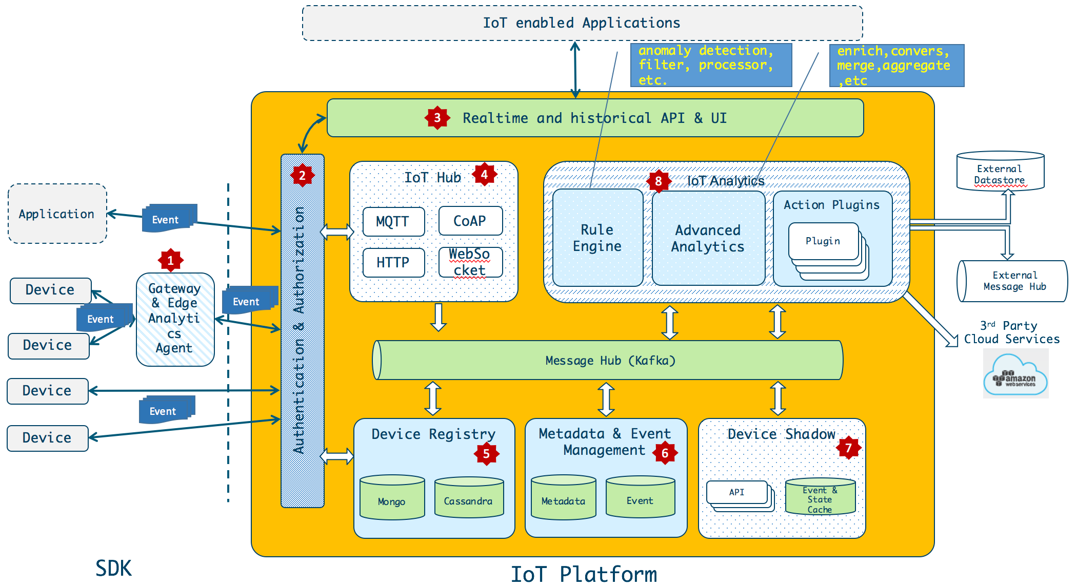This IoT Platform provides an SDK to help you easily and quickly connect your hardware device or your mobile application. This IoT Device SDK enables your devices to connect, authenticate, and exchange messages with this IoT Platform using the MQTT, HTTP, or WebSockets protocols. The Device SDK supports Java/JavaScript, and includes the client libraries, the developer guide, and the porting guide for manufacturers. You can also use an open source alternative or write your own SDK.