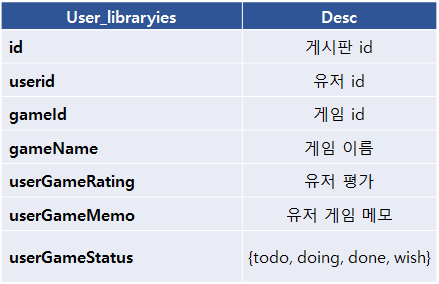User_libraryies 테이블은 유저의 라이브러리, 위시리스트 기능을 사용하기 위한 테이블이다. userid는 user테이블의 id를, gameId는 game 테이블의 id를 참조키로 사용하고 있으며 두 키의 중복은 불가능하다. gameName은 game 테이블의 name을 사용한다. userGameRating은 유저가 해당 게임을 평가한 수치이며 5점 만점을 사용한다. userGameMemo는 유저가 해당 게임의 메모 및 리뷰를 사용하기 위한 속성이다. userGameStatus는 {todo, doing, done, wish}의 값을 가지며 각각 할 게임, 하고 있는 게임, 끝낸 게임, 사고 싶은 게임을 의미하며 wish 값은 wishlist를 표기할 때만 사용하며 library에서는 사용하지 않는다.