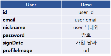User Table은 User의 정보를 나타내는 스키마이다. email은 email 형식 ex)[email protected]을 갖춰야한다. nickname과 email은 중복 추가가 불가능하다. password는 암호화되어 저장한다. signDate 는 가입한 날 기준으로 UNIX Time을 저장한다. profileImage는 유저의 프로필 사진을 말하며 image의 url 정보가 들어있다.