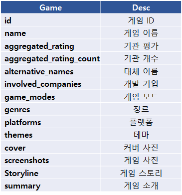Game Tabel은 Game 정보를 나타내며 IGDB 게임 데이터를 받아와서 저장한다. id는 IGDB에서 사용하는 게임 id 숫자로 표기한다. name은 게임의 이름, aggregated_name과 aggregated_count는 각각 기관이 게임을 평가한 점수 5점 만점이며 평가한 기관의 수를 나타낸다. alternate_names는 게임이름 뿐만 아니라 일본어, 한국어 등 다양한 언어로 게임을 표기하며 gernes, themes 는 게임의 category, platforms는 실행하는 게임의 플랫폼을 표기한다. cover는 게임의 포스터 사진을 나타내며 각각 Width, height, url 정보가 들어가 있다. screenshots는 인 게임 사진을 나타내며 Width, height, url의 속성을 갖고 있다.